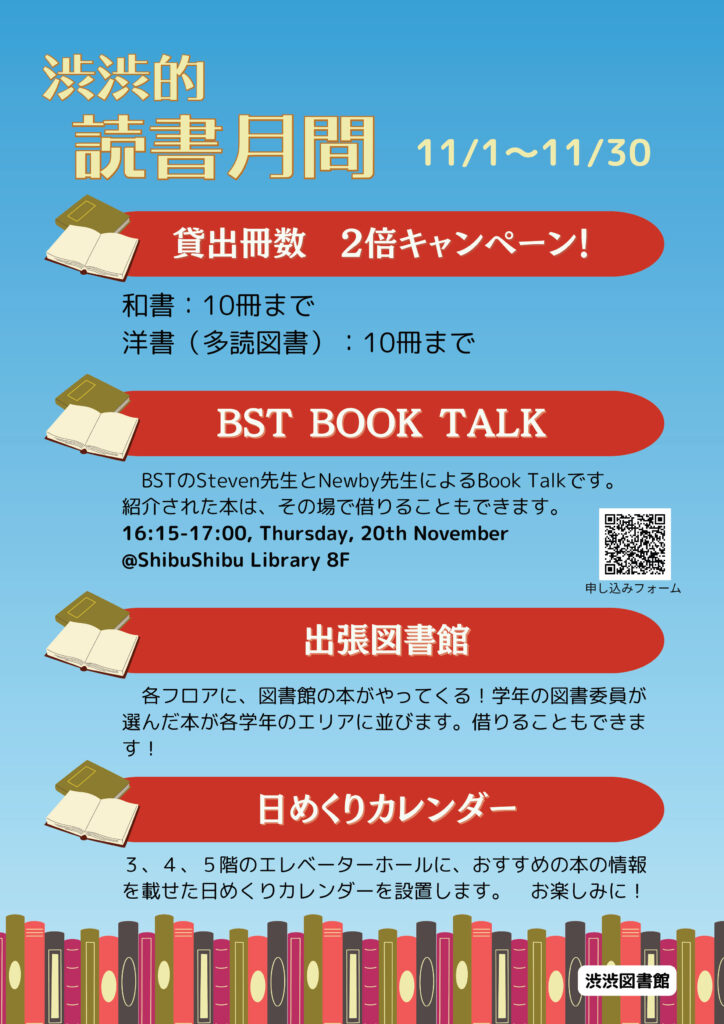 毎年恒例 British School in Tokyo(BST)の司書教諭によるブックトークが11月20日に開催されます。紹介された本は渋渋図書館で借りることができます。 - 出張図書館
