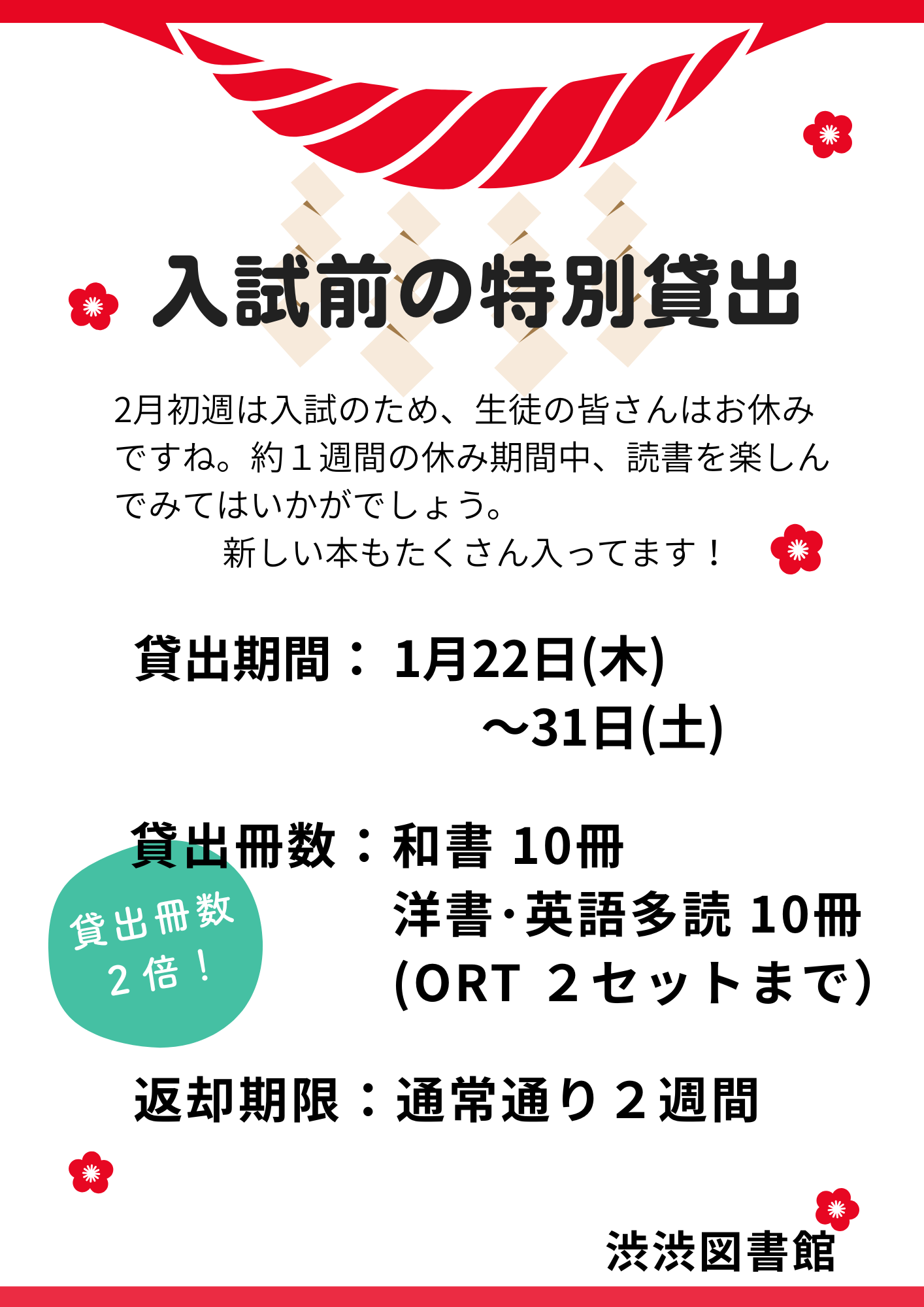 渋渋図書館 特別貸出のお知らせ 2026.01.23 渋渋図書館から「入試前の特別貸出」についてお知らせします。 特別貸出のお知らせ入試前の特別貸出として、1月22日(水)~31日(土)の期間は、通常より多くの冊数を借りることができます。貸出期間は通常通り2週間です。この時期のまとまった時間を大切にして、たくさん本を読みましょう。